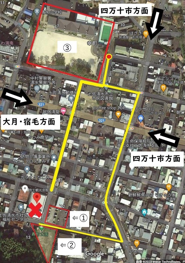 bunkakaikan | 2025年10月11日 南こうせつコンサートツアー2025~神田川~ 駐車場のご案内 ①土佐清水商工会議所&文化会館専用駐車場 ②寿町公演(※雨天使用不可) ③土佐清水市立清水小学校 ※①②が満車となり次第、③へご案内いたしますので 先に③へ駐車する場合は、時間帯によっては駐車場係が 居りませんのでご注意ください。 ✖(会場)、黄色線が③駐車場へのルート案内となります。 皆さまお気をつけてお越しください。